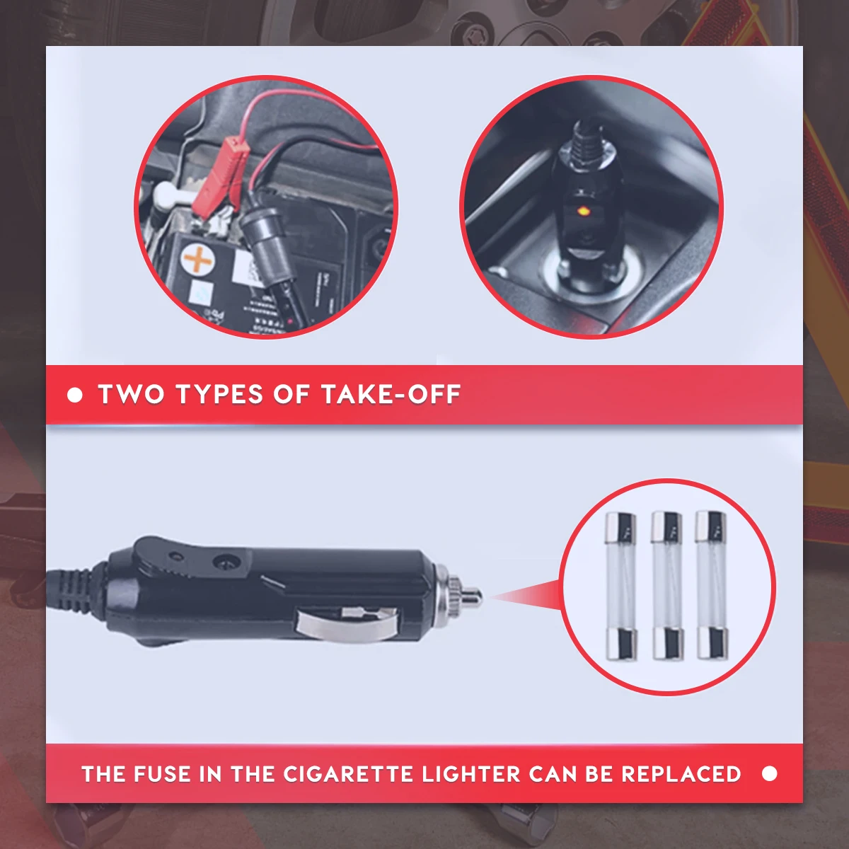 Kit includes: 1* Plug for car battery and 1* Safety hammer and 1* Hydraulic jack and 1* Electric wrench and 1* Cuff and 1* Gloves and 1* Fuses and 1* Hex wrench and 1* Air filling nozzle and 1* User manual