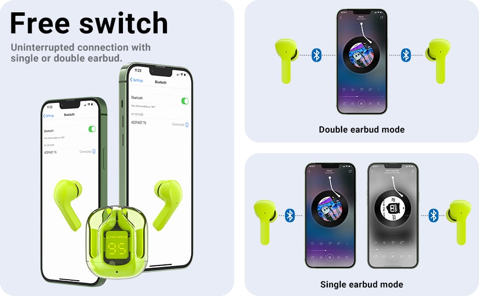- [Smart Touch Control and Comfortable Fits] ACEFAST wireless earbuds for iphone support touch control of each individual earbud, you can easily control answer or hang up calls, play or pause, volume up or down, change songs etc without using the phone. T6 Bluetooth earbuds with 3 different sizes of earbuds for most ear canals. The attached silicone case fits perfectly with the wireless earbuds, giving you a comfortable experience.