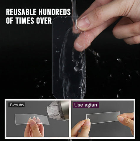- REUSABLE HUNDREDS OF TIMES OVER: Once removed, this tape can be reused. Simply wash with water and after it dries, the adhesive will return, good to use again. It is cost effective and can be reused hundreds of times. This crystal clear alternative to nails and fasteners that clear tape can stick to almost any smooth, clean and non-porous surface and stay there, which It can hold up to 1 KG (2.2 LBS) on a smooth surface. The double sided tape is coated with adhesive on both sides for easy hang